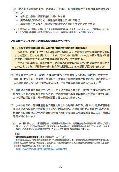 ➣ 基礎疾患があるなど、感染症に感染すると重症化するおそれがある ※ 上記以外にも、個別の申請により申告期限等が延長される場合がありますので、ご不明な点がござい ましたら所轄の税務署(調査課所管法人については所轄の国税局)へご相談ください。