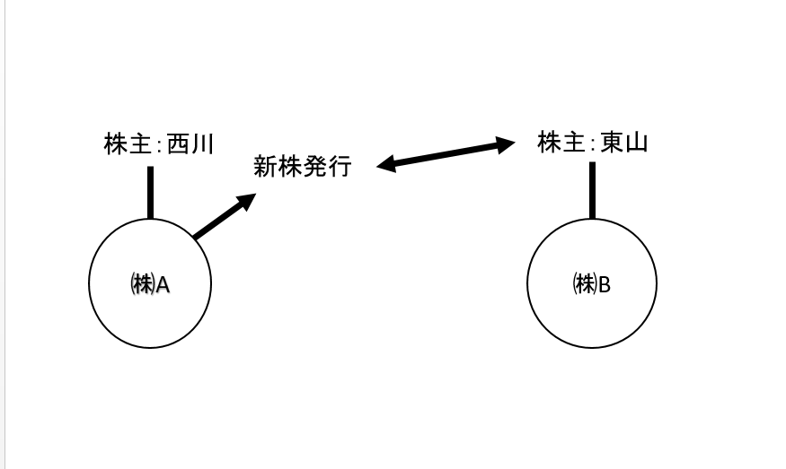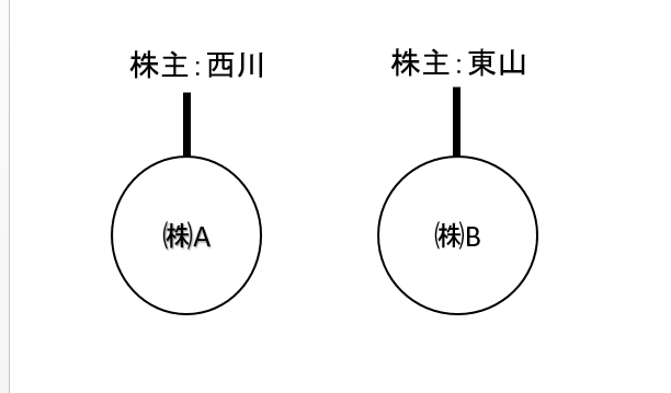 株式交換は二社を完全親子会社にします。株式会社A社の株主は西川さん、株式会社B社の株主は東山さんとします。株式会社A社を親会社、株式会社B社を子会社にさせたいとします。