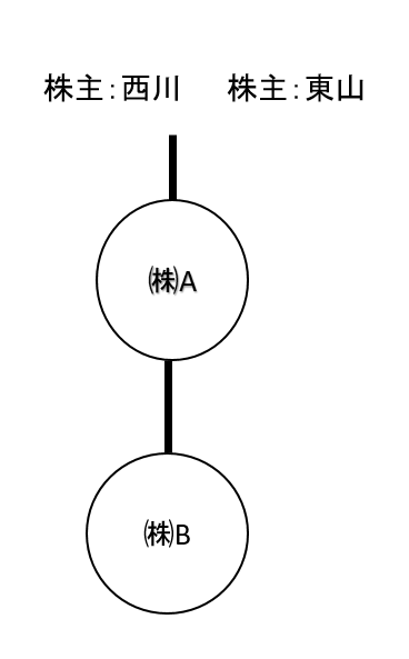 東山さんはは株式会社A社の株を持つことになります。株式会社B社の株主は株式会社A社のみとなり完全親子会社になります。株式会社A社の株主は西川と東山になります。株式会社Aは親会社になりました。