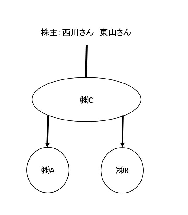 なので西川さんと東山さんは株式会社Cの株式を持つことになります。株式会社A社と株式会社B社の株主はC社となります。株式会社A社と株式会社B社は子会社となります。株式会社Cは親会社となります。