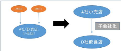 分社型は子会社化です。株式会社A社が飲食店と小売店をしていたとします。株式会社A社の株主はBとCです。新たに株式会社D社を作り飲食店部門を株式会社A社から分割させるとします。D社の株をA社に渡します。D社は100%子会社となります。A社の株主は変わりません。
