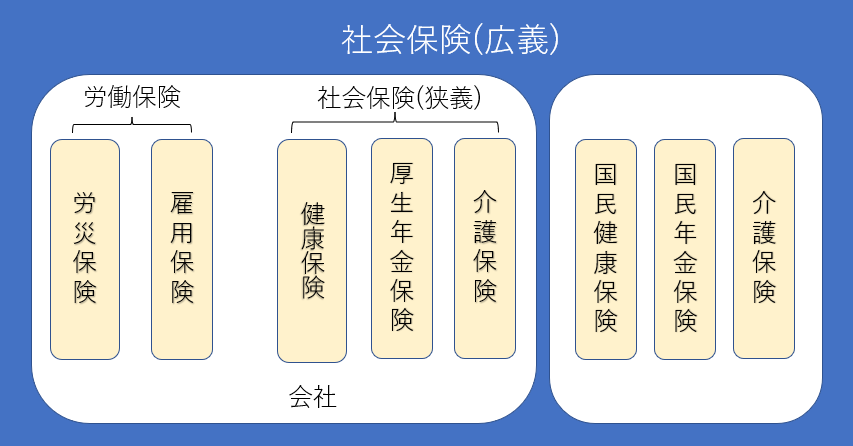 「厚生年金保険」「介護保険」の事を言います。(狭義の社会保険)